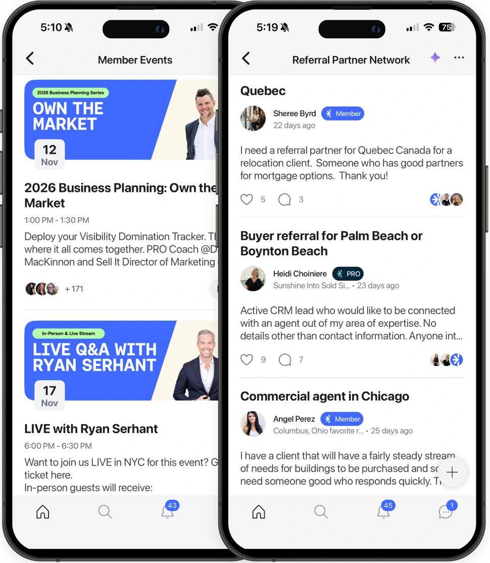 Stream courses between showings, drop into live Q&As with Ryan Serhant for real-time answers, connect with agents across the world, trade referrals, and grow your network in real time from the Sell It app.